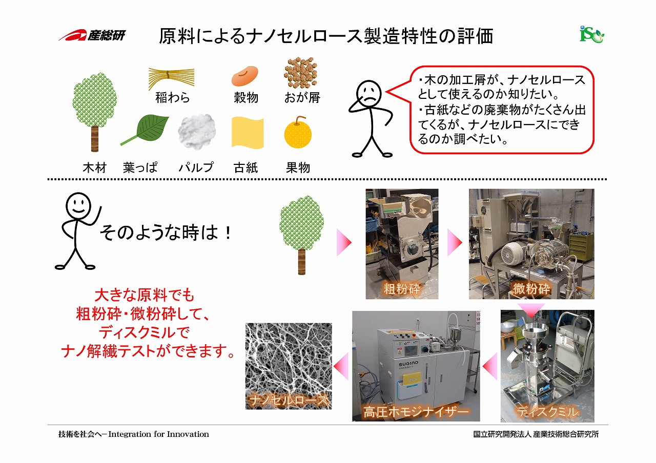 当研究グループでは、これでに、各種木材由来の木粉、各種パルプ、柑橘果皮や大豆の皮などの食品系残渣、稲わらやもみ殻、サトウキビ廃材のバガスなどの農業系残渣からナノセルロース製造テストを実施した経験があります。製造装置としては、木材チップも原料とできるように、粗粉砕カッターミル、微粉砕できる気流粉砕機を備えて前処理できるようにしています。さらに、これら原料のナノ化は、ディスクミルを4台(ディスク径:6インチ、15インチ)、200MPa以上で処理可能な高圧ホモジナイザーを3台(ナノ化の機構が異なる)、備えています。 |