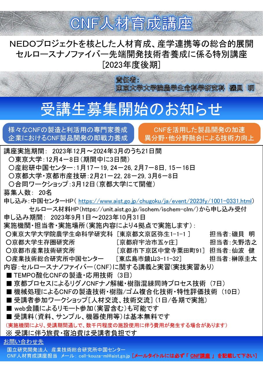 ・お申込み多数の場合は、受講目的、CNF実用化への意気込み、分野の偏りなど、皆様からの申込内容を考慮し実施機関担当者相互協議により受講者を決定させていただきます。そのため、ご希望に添えない場合がございますので、予めご了承ください