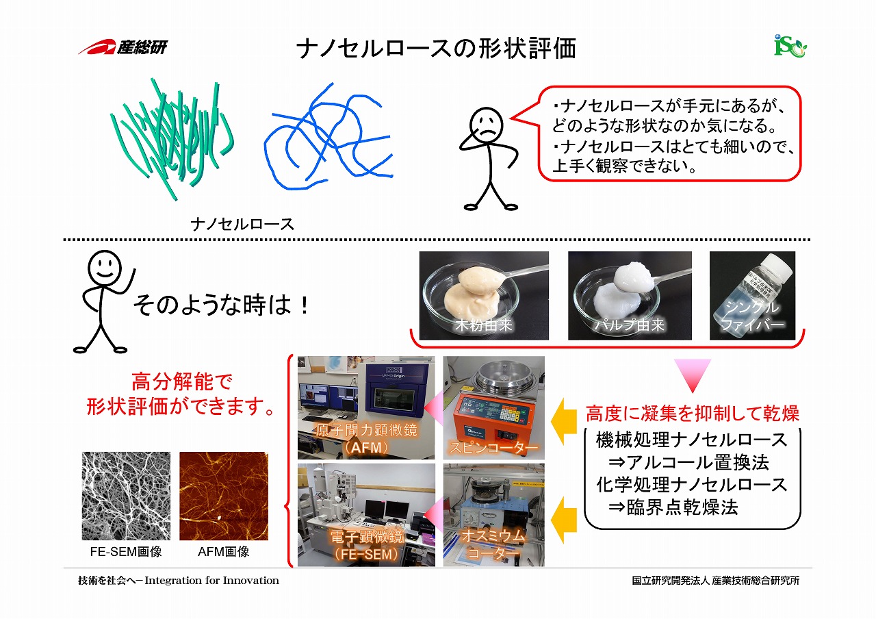 | 解説:入手したり、作製したりしたナノセルロース(セルロースナノファイバー/CNF)を使いこなすためには、まずは、その特性を知る必要があります。特性が分からないと、複合化等して作製した材料の特性が発揮されない場合の原因もつかめなくなります。ナノセルロースは、今までにない、超微細な有機物であり、極めて高い凝集力などから、特性解析は簡単ではありません。多くの機器分析では、乾燥サンプルを必要としており、乾燥サンプルの調製も課題になる場合があります。 当研究グループでは、高度に凝集を抑制したサンプル乾燥法を構築しており、調製した乾燥サンプルを用いて、高分解能走査型電子顕微鏡(FE-SEM)による評価、原子間力顕微鏡顕微鏡による評価、比表面積評価、X線回折による結晶性評価、核磁気共鳴装置(NMR)による精密分子構造評価が実施可能です。また、ナノセルロースの形状・サイズの情報は得られませんが、品質管理にも利用できるレーザー回折法による粒度分布測定、他の分析方法では得られない情報が得られる沈降特性評価、レオメーターによる粘弾性評価を実施することもできます。さらに、ナノセルロースの純度等を調べるため、加水分解後の糖組成を高速液体クロマトも利用できます(セルロースは基本的にはグルコースのみから形成されていますが、木材を原料とした場合には、ヘミセルロース等が必ず一定量含まれています。木材パルプは、精製してもヘミセルロースをゼロにすることは相当に困難です)。 |