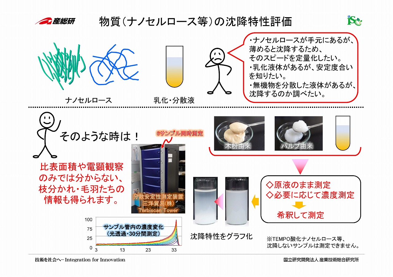 | 参考:「研究紹介」 ・沈降法によるナノセルロースの評価 参考:「技術のポイント一覧」 ・ナノ化率(完全にナノ化してないセルロース繊維の指標/一部がナノ化したセルロース繊維の指標) ・沈降法によるナノセルロースの形状・形態評価 |