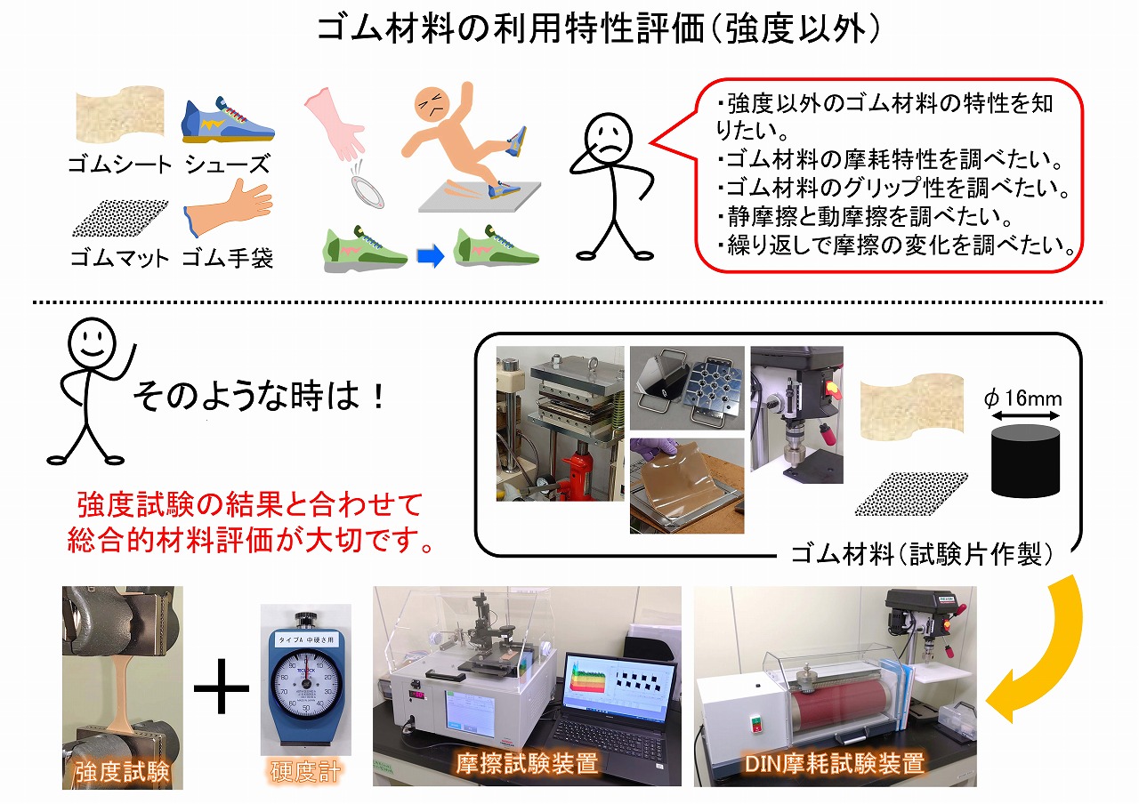 | 解説:ゴム材料は、様々なゴム素材とのブレンドやフィラーの種類や添加量を制御して、多様な用途の製品が製造されています。それらゴム材料の物性として、引っ張り強度などは重要な項目です。しかし、製品としての利用性では、耐摩耗性やグリップ性なども重要な項目となります。 当研究グループでは、JIS規格や国際標準法に準拠した条件でゴム材料の特性評価が行える装置を準備しています。DIN摩耗試験装置では、JIS K 6264-2(A法、B法)、ISO4649、DIN53516に準拠した測定ができます。また、DIN摩耗試験に用いる試験片を作成するための、専用金型や専用の切り抜き機も用意しています。また、摩擦特性評価装置では、専用の圧子を一定荷重でサンプルシートに当て、サンプルを平行移動させることで、静摩擦および動摩擦を評価できます。さらに、繰り返しによる、摩擦特性の変化も評価可能です。樹脂シートについては、JIS K7125に準拠した摩擦評価もアタッチメント交換で対応可能です(現在は付属していません)。ゴム材料の強度は、耐摩耗性や摩擦特性、硬度などとも相関があります。これら物性を評価して、総合的に材料の特性を明らかにすることが大切です。 |