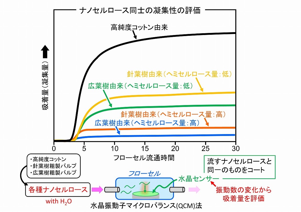 説明図では、「水晶振動子マイクロバランス(QCM)法」を用いて、ナノセルロースの種類による凝集性を評価した結果です。粗製パルプ(針葉樹/広葉樹)から製造したナノセルロースは、酵素を用いて表面のヘミセルロースのみを加水分解しで、その量を調節しています。このようにして製造した様々なナノセルロースを用いて、水晶振動子センサーをコートし、そのセンサーをフローセルにセットして、同じ種類のナノセルロースをポンプで流しました。相互作用によって、センサーの表面に流した同じナノセルロースが吸着する程度を調べることで、凝集性が評価できます。