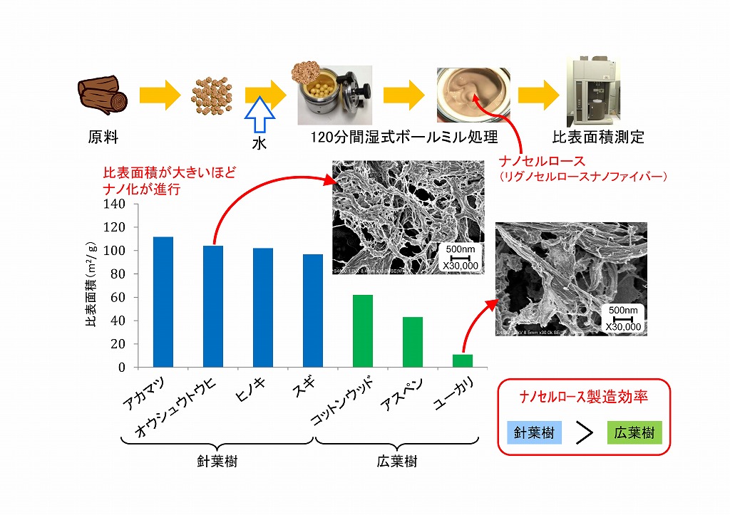 (説明図1)その結果,得られた生成物の比表面積は,樹種によりことなり,広葉樹と比較して,針葉樹はナノファイバー製造効率が高いことが分かりました。ただ,この場合の比表面積は大き場合でも110m2/gであるため,全てが幅20nm以下になっているわけではありません。