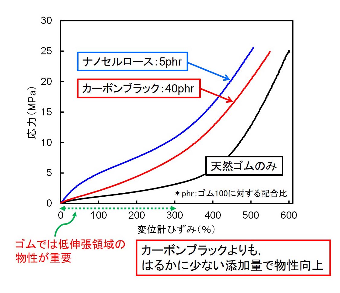 - ゴムは単体では強度がほとんどありません。そのため、フィラーの添加がとても重要です。タイヤなどのゴム製品では、カーボン・ブラックが大量に添加されています。しかし、ナノセルロースを、添加すると、とても少ない量で、カーボン・ブラック以上の補強効果を発揮させることができます。