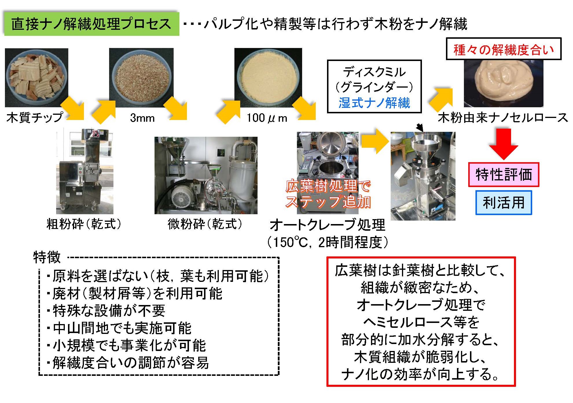 - ディスクミル(グラインダー)装置は、ナノセルースの製造では良く用いられているナノ解繊装置です。当研究グループにおいても、木粉やパルプを原料として、同装置を用いてナノセルロースを製造しています。パルプはその製造過程で、木質が本質的に持っている強靱化要因が、部分的にでも取り除かれているため、ナノ解繊は比較的効率的に進行します。しかし、木質(木粉)から直接的にナノセルロースを製造しようとした場合、そのままでは効率が低下します。