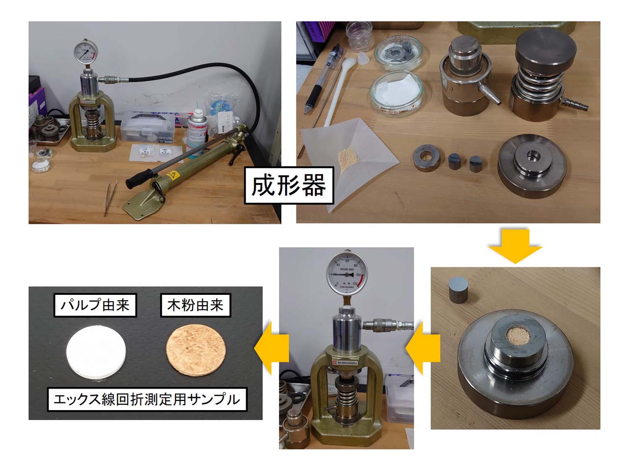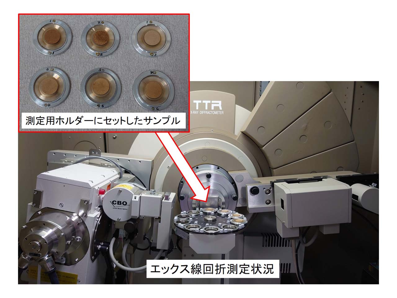 当研究グループでは、測定を円滑に進められるように、あらかじめサンプルをペレット化します。ペレット化装置としては、赤外分光分析用のKBr(臭化カリウム)錠剤作成器を流用しています。当研究グループ保有のエックス線回折装置は、オートサンプラー(自動サンプル交換器)が取り付けてあるため、あらかじめサンプルペレットを作製しておけば、測定が一度に進行できます。
