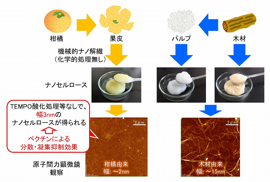 しかし、植物を原料として、TEMPO触媒酸化法等の化学的処理を併用しなくても、柑橘類の果皮等からは、比較的簡単な機械処理のみで、幅3nmのナノセルロースを得ることができます。柑橘類果皮等は、木材のような強靱な細胞壁構造を形成しておらず、さらに、共存しているペクチン等の影響で、セルロースミクロフィブリルの集合も制限されています。これらのことから、柑橘類果皮からは、幅3nmのナノセルロースを得ることができます。ただし、製造時に、ペクチンを完全に除いてしまうと、ナノセルロースは集合するため、ペクチンの共存が重要です。