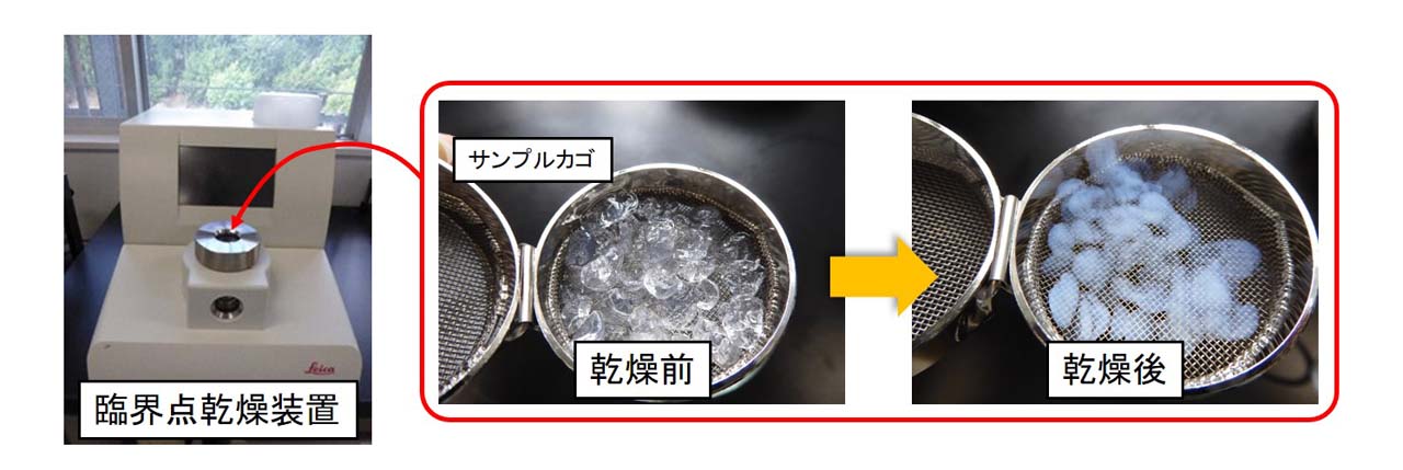 - 大量の水に分散した状態で製造されるナノセルロースを凝集を抑制して乾燥することは容易ではありません。当研究グループでは,通サンプルは,t-ブタノール置換による凍結乾燥方で乾燥ナノセルロースを調製し,比表面積測定や高分解能電子顕微鏡観察などに供しています。しかし,この方法も十分とは言えない場合もあります。そこで,当グループでは,超臨界二酸化炭素を用いた,臨界点乾燥装置も用いています。