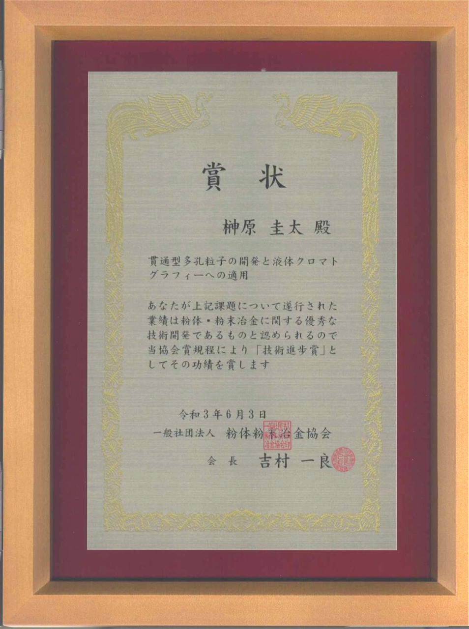 • 当研究グループりの榊原圭太主任研究員が、一般社団法人粉体粉末冶金協会の『第39回技術進歩賞』を受賞しました。おめでとうございます!受賞のテーマは、榊原圭太主任研究員が前職(京都大学化学研究所)から研究を進めてきた、「貫通型多孔粒子の開発と液体クロマトグラフィーへの適用」です。
