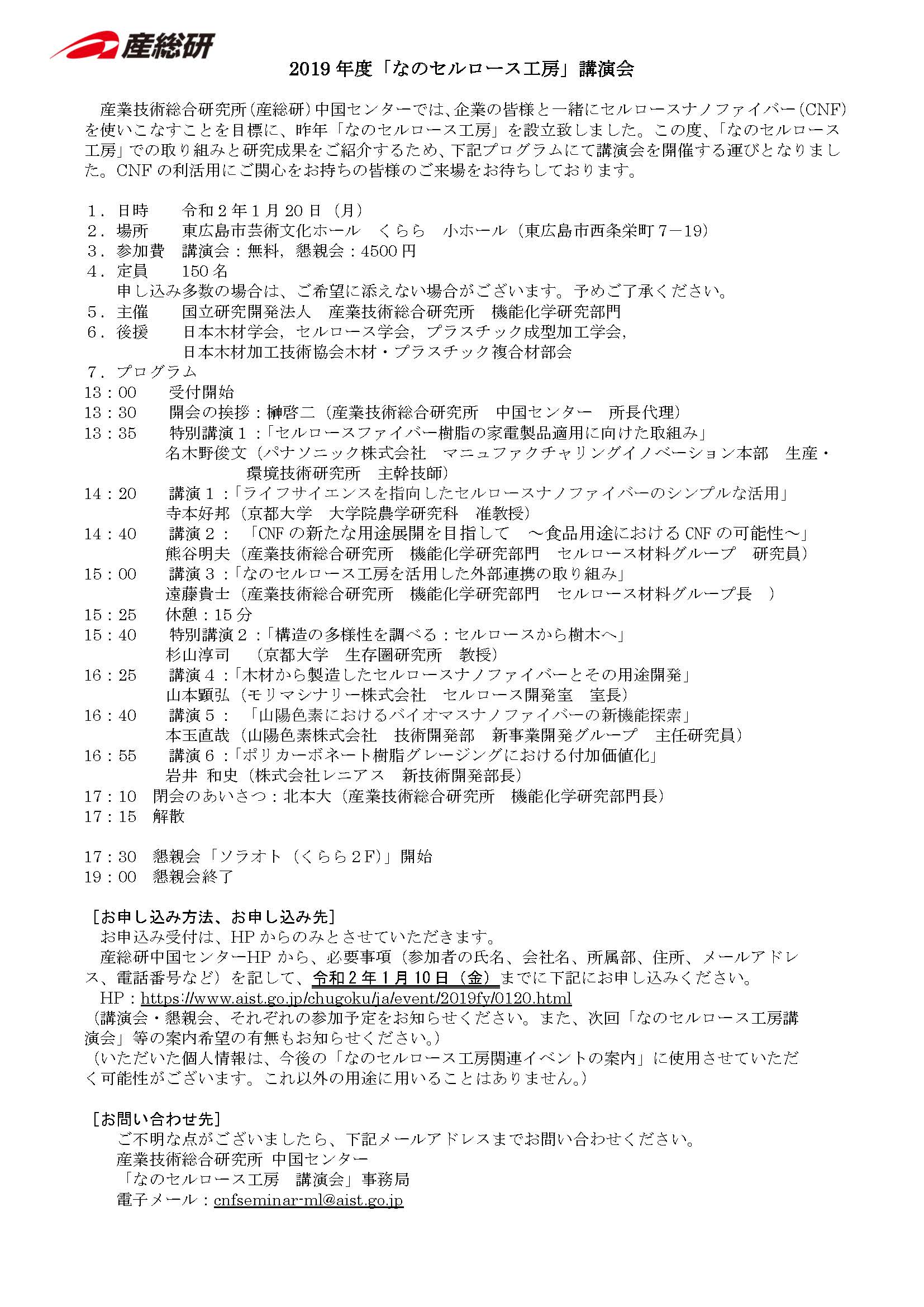 〒739−0046 広島県東広島市鏡山3-11-32 国立研究開発法人 産業技術総合研究所 中国センター 機能化学研究部門 セルロース材料グループ