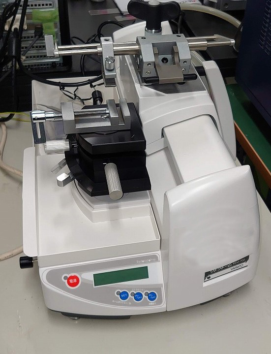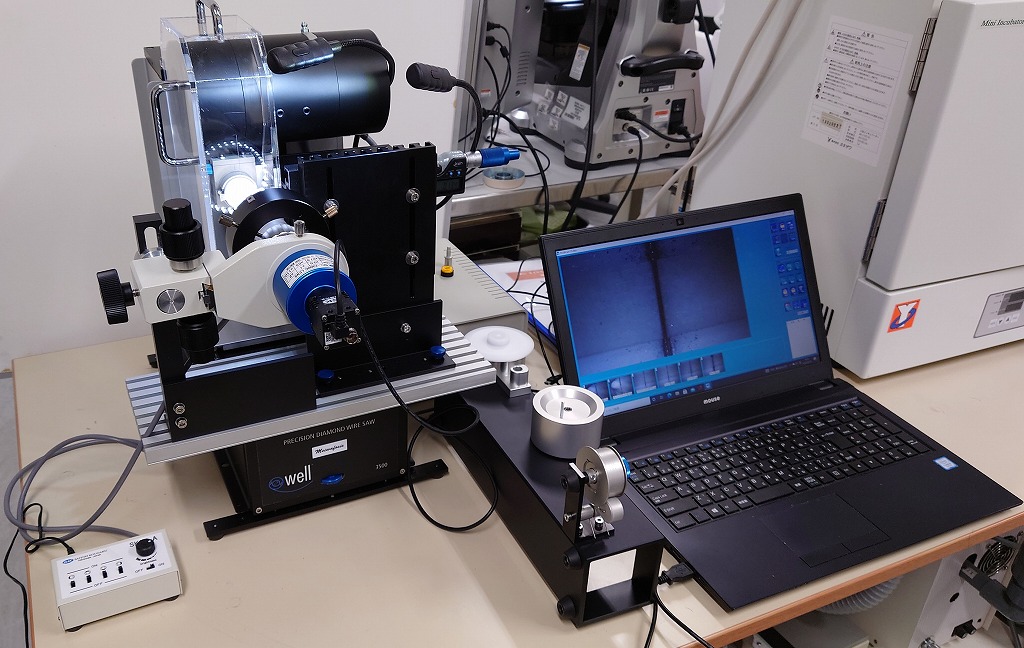| 仕様・用途 | 樹脂等成形品・形成体の内部構造、積層体の断面構造、異物部分の切り出しにより、走査型電子顕微鏡等で形状や構造を観察するためもちいる。成形体を変形や崩壊させることなく軽い力で精密に切断する。金属や鉱物の切断も可能。マイクロスコープによりワイヤー位置を確認しながら切断可能。 |