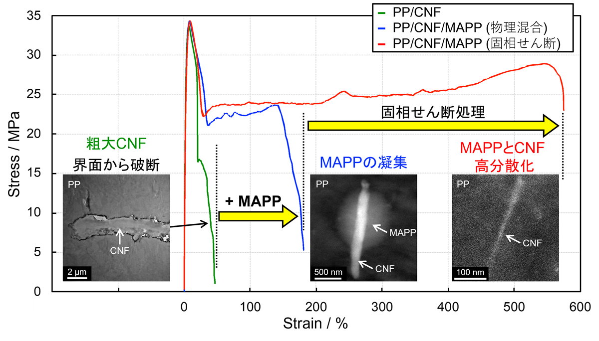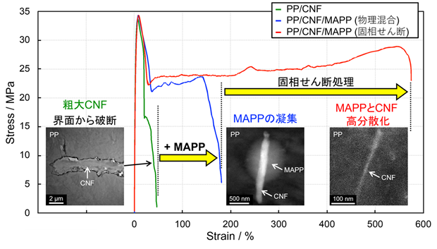 | 【結果】 図1に示すように、MAPPの添加、さらにはMAPP添加時の固相せん断処理により、大幅に引張特性が向上しました。これら3種類のサンプルをTEMで観察した結果、MAPPを添加していないサンプルでは、マイクロスケールのCNF凝集体が多数存在することが分かりました。次に、物理混合によりMAPPを添加したサンプルでは、過剰量のMAPPがCNFの周囲に存在している様子が観察されました。最後に、固相せん断によりMAPPを混合したサンプルでは、CNFがフィブリル単位で分散していました。したがって、引張特性の向上は、 ①MAPP添加によるCNFの相容性の向上 ②MAPP添加時の固相せん断処理によるMAPPの有効活用とCNFの微細化・高分散化に起因することが明らかになりました。  |