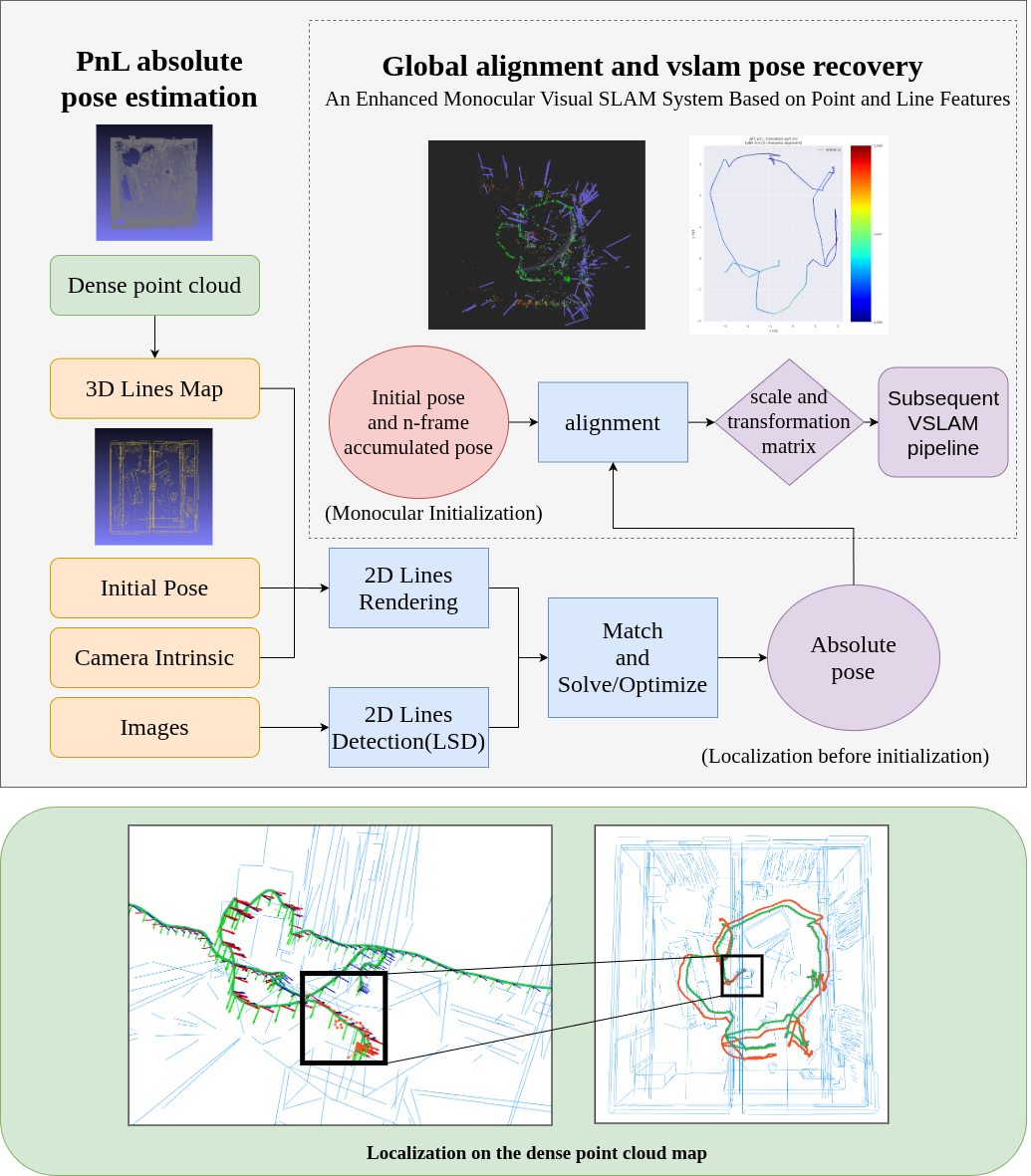 Monocular Visual SLAM is attractive for its low cost and portability, but it suffers from scale ambiguity and typically cannot localize directly in heterogeneous prior maps such as dense LiDAR/3D-reconstruction point clouds. This project enables a monocular point-line SLAM pipeline to perform absolute localization in a pre-built dense point cloud map. We first extract 3D structural line segments from the dense point cloud offline, and then detect 2D line segments in incoming images online. By establishing robust 2D-3D line correspondences and solving a Perspective-n-Line (PnL) optimization, the system estimates metric absolute camera poses during initialization, recovering real-world scale without requiring additional sensors. After monocular initialization, multiple PnL poses are accumulated and aligned with the SLAM trajectory to compute a fixed Sim(3) transformation, which is then propagated throughout tracking and mapping to maintain globally consistent poses in the dense map coordinate frame.