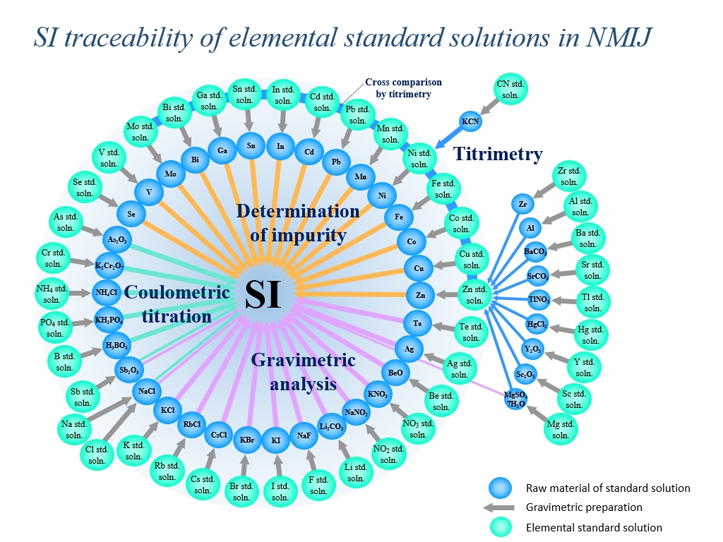 無機分析では、その分析対象が工業材料でも環境試料でも何であっても、濃度や純度の分かっている標準物質の利用が不可欠です。それらの値は、世界中のどこで誰が使っても共通の尺度(可能な限りSI単位)に基づいていなければなりません。