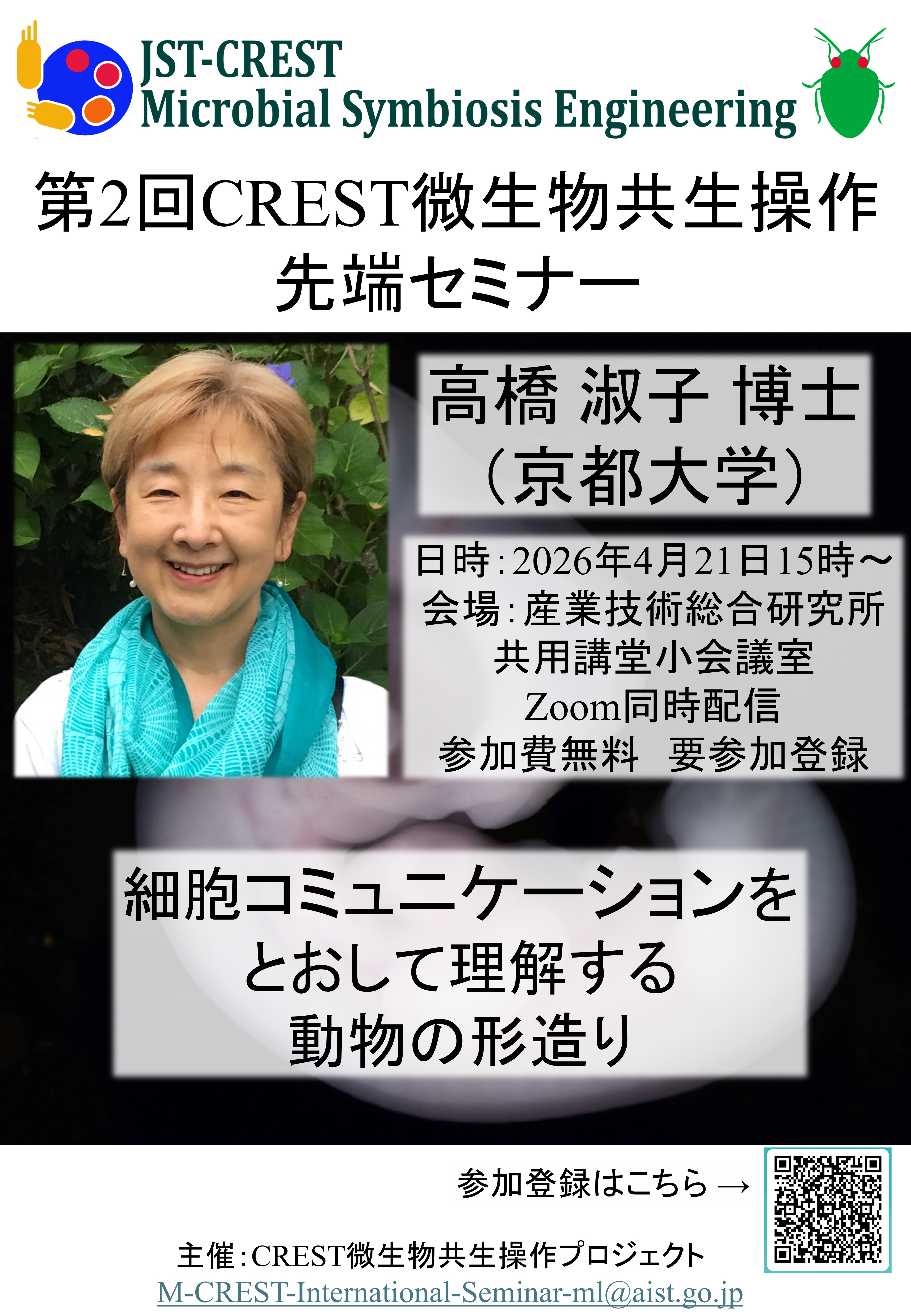 第2回CREST微生物共生操作先端セミナーのお知らせです。京都大学大学院理学研究科の高橋淑子博士にご講演いただきます。オンサイトとZoom配信のハイブリッド実施です。