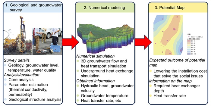 Specifically, we are developing technologies for evaluating geothermal potential and suitable sites for geothermal heat utilization, evaluating the economic and environmental benefits of introducing GSHP systems , and studying measures to improve the social acceptability of shallow geothermal heat.