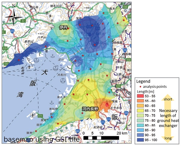 In Japan, the number of GSHP systems installed tends to be high in regions with large heating loads, such as Hokkaido, Tohoku, and Shin’etsu regions, but we created and published a suitabilityl map for the Osaka Plain, which has a large cooling load compared to these regions (Fig.3 and 4).