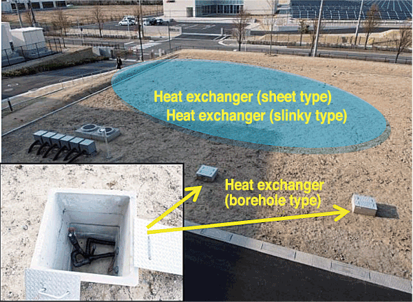 This GSHP system utilizes two types of horizontally buried heat exchangers installed at a depth of 1 to 2m and a vertically buried heat exchanger (borehole type) at a depth of approximately 40 m and 100 m.