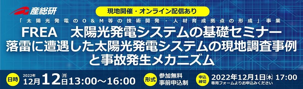 2022年12月12日(月)「FREA 太陽光発電システムの基礎セミナー 落雷に遭遇した太陽光発電システムの現地調査事例と事故発生メカニズム」開催のご案内