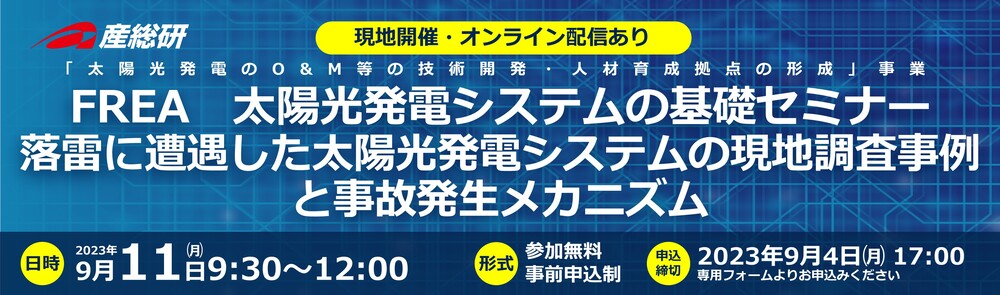 2023年9月11日(月)「FREA 太陽光発電システムの基礎セミナー 落雷に遭遇した太陽光発電システムの現地調査事例と事故発生メカニズム」開催のご案内