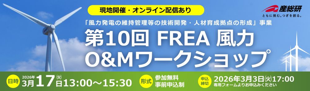 | 参加申込 | 参加申込締切:2026年3月3日(火)17:00 ※参加における注意事項をご確認の上、参加申込フォームより必要事項を入力し、参加申込をお願いいたします。 ※参加申込の際、メールアドレスが必要です。 ※参加申込フォームがご利用できない場合は、事務局宛に件名「第10回FREA風力O&Mワークショップ参加申込」、本文「ご氏名、ご所属、就業地(都道府県・市町村)、電話番号、国籍、メールアドレス、参加方法(現地、またはオンライン)」を記載していただき、お申込ください。 |