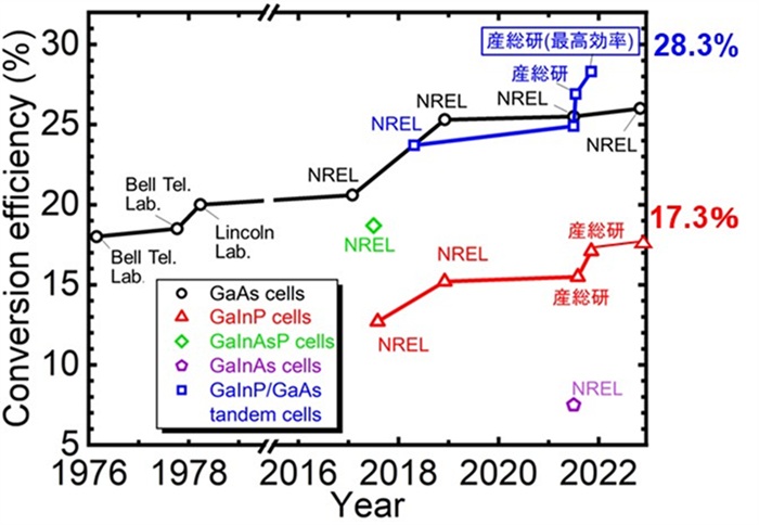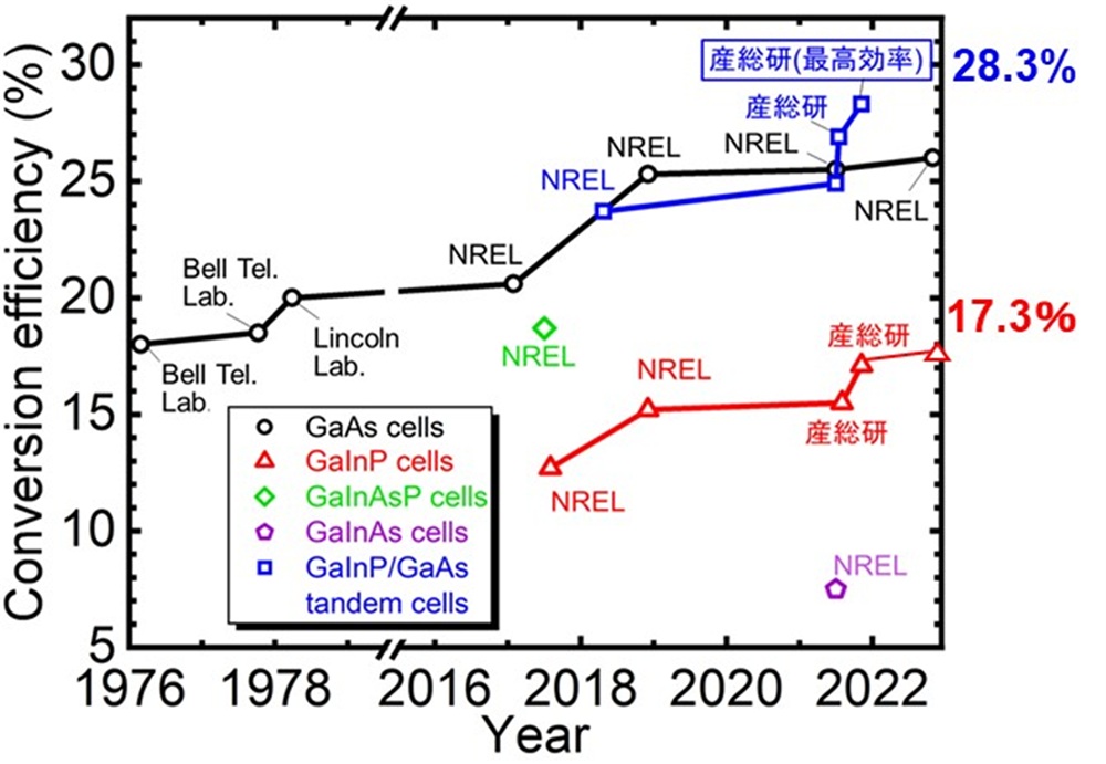 近年NRELと当チームが開発を始めましたが、高品質Al系材料の太陽電池導入に一早く成功した我々が、InGaP/GaAs2接合太陽電池、InGaP単接合太陽電池それぞれの変換効率最高記録を保有しています。