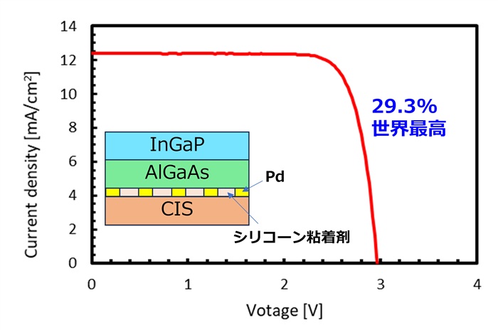 本技術開発において、シリコーン粘着剤を介在した新型スマートスタック開発により、InGaP/GaAs//CISの3接合セル(//はスマートスタック部)で世界最高の変換効率29.3%を達成しました。