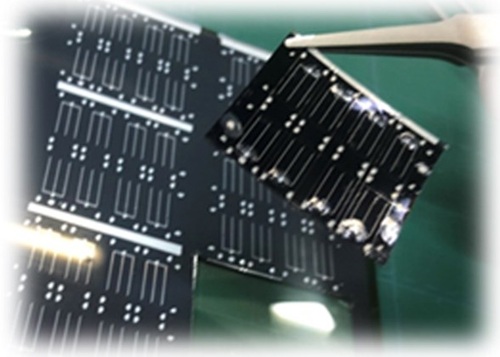 1枚の軽量フレキシブル基板シートに複数の太陽電池セルを集積させた構造のCIS系太陽電池ミニモジュールで、世界最高となる光電変換効率(18.6%、面積約68cm2)を達成しています。