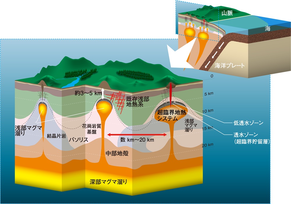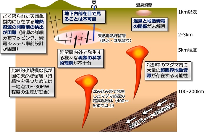 沈み込み帯に起源を有する超高温・高圧の超臨界地熱流体を発電に利用することにより、国内の地熱発電総容量を飛躍的に増大させる可能性があります。