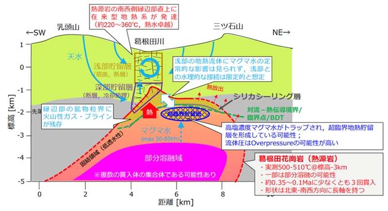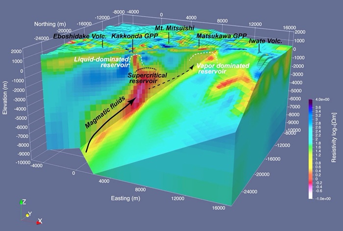 岩手県の葛根田地域では、比抵抗構造探査(MT法探査)、微小地震、地震波の反射面が等の調査結果から、地熱系概念モデルを作成し、地表下約3kmに超臨界地熱貯留層が形成されていると推定しました。