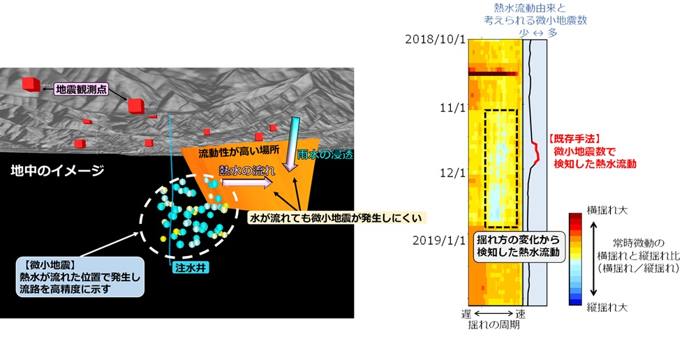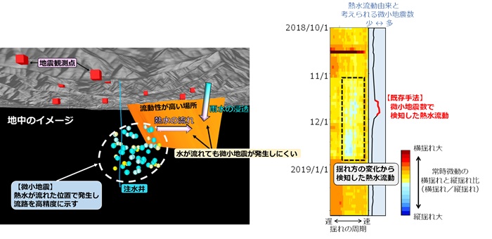 また、震源位置に加え、地震波に含まれる散乱波や反射波および地面の定常的な揺れ(常時微動)の性質変化等の解析から、地下での水の流れや、貯留層構造の可視化を実現しました。