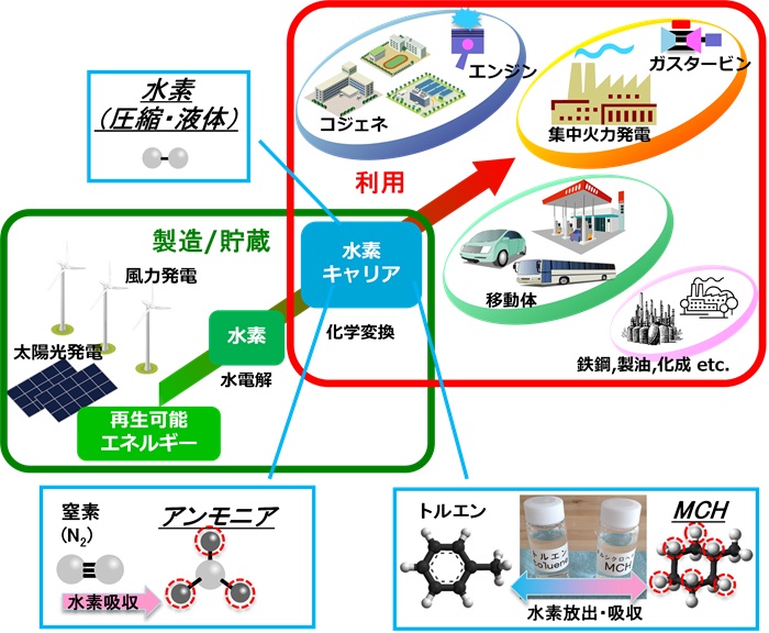 2050年のカーボンニュートラル社会の実現のためには、水素キャリアを様々なアプリケーションで安全かつ効率的に利用する技術を確立する必要があります。
