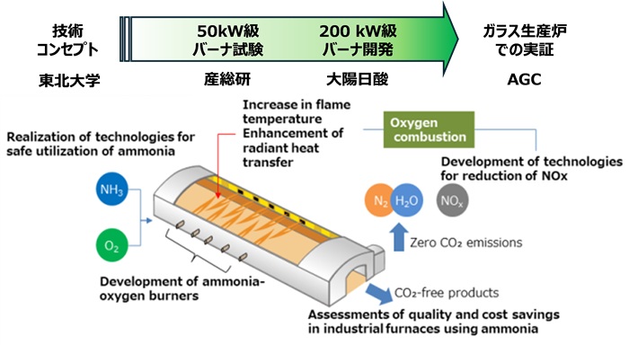大陽日酸(株)、AGC(株)、東北大学と共同で実施している本事業では、ガラス溶融炉向けに火炎輻射の強化を図るアンモニアの酸素燃焼バーナを開発し、輻射伝熱の評価とともにNOx低減技術の技術検証から実生産炉での実証を実施する予定です。(図1)