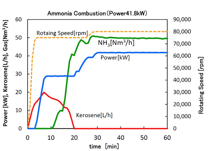 小型ガスタービン(50kW定格)での燃焼利用に挑戦し、世界初となる、メタンとアンモニアの混焼発電と、アンモニア100%の専焼発電に成功しました(図4)。