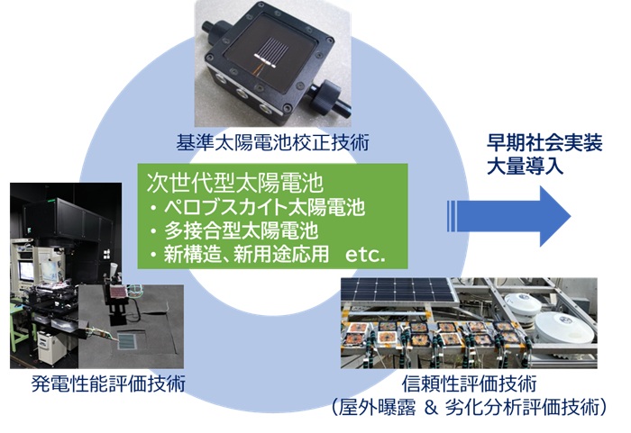 太陽電池の価値に直結する基準太陽電池校正技術、太陽電池性能評価技術、屋外設置環境における太陽電池モジュールの性能・発電量評価技術の開発を推進し、太陽電池の評価・標準の高精度化およびトレーサビリティ体系の維持・普及促進を図ります。
