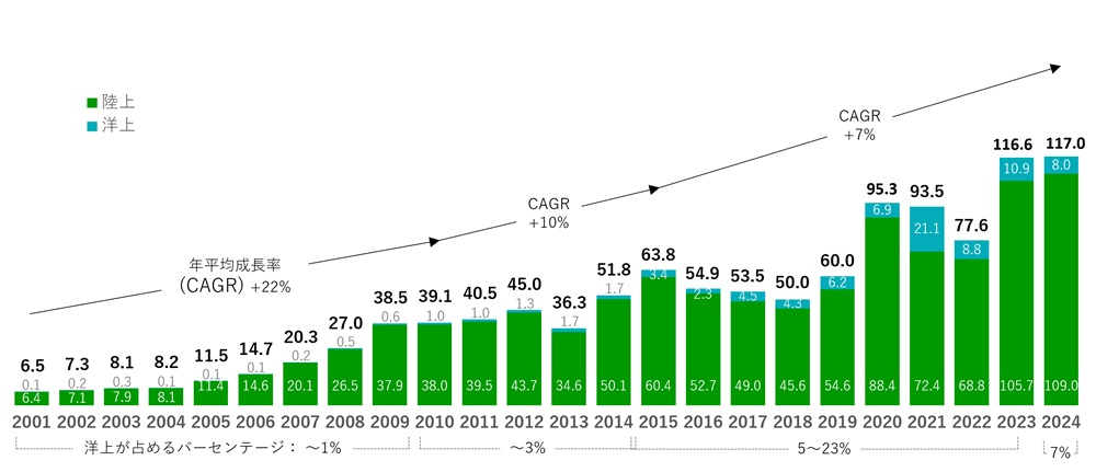 世界の風力発電導入量において、洋上風力が占める割合(単年)は10〜20%以上に達し、本格的な洋上風力の時代に入っています。