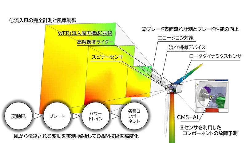 先端的なO&M改善技術を開発、実証するため、気象観測マスト、ナセル搭載ライダーを新たに導入するとともに、プラズマ気流制御電極、応力発光塗料等、先端的なセンサー、デバイスを搭載した風車ブレードを製造しています。
