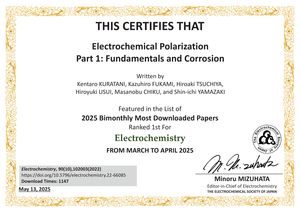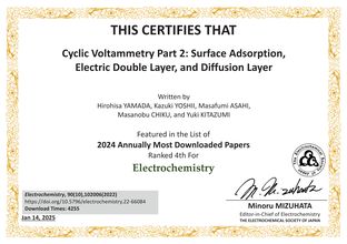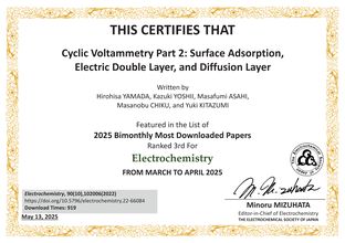 | 受賞名 | 2020年 Electrochemistry誌ダウンロード数上位論文 (7月と8月度のダウンロード数第1位、年間ダウンロード数第4位) |