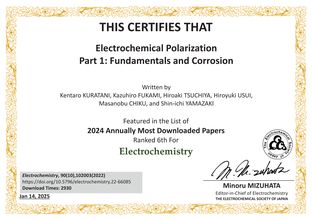| 受賞名 | 2024年11・12月 Electrochemistryダウンロード回数上位論文 (ダウンロード回数第3位) |
