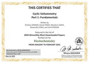 | 受賞名 | 2025年3・4月 Electrochemistry誌ダウンロード数上位論文 (ダウンロード数第3位) ![]() |