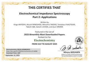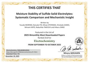 | 受賞名 | 2025年7・8月 Electrochemistry誌ダウンロード数上位論文 (ダウンロード数第1位) ![]() |