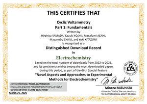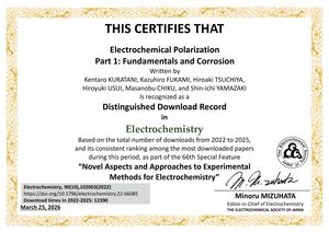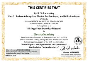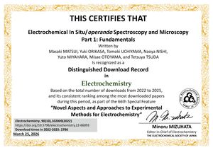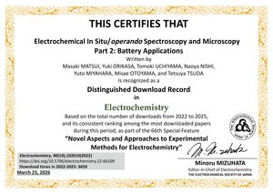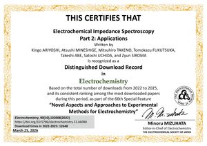 | 受賞名 | 2025年3・4月 Electrochemistry誌ダウンロード数上位論文 (ダウンロード数第1位) |