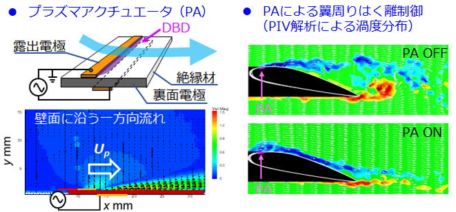 誘電体バリア放電(DBD)を利用したプラズマアクチュエータ(PA)をはじめとする先進的な流体制御デバイスを開発し、流体機械のエネルギー効率を改善するための研究を行っています。流体制御技術を自動車、高速列車、航空機、ターボチャージャなどの流体機械に適用し、次世代モビリティにおいてコアになる革新的な流体制御システムの構築を目指します。 例えば、発電用ガスタービンや航空用ジェットエンジンの構成要素であるタービン翼列の空気力学的性能を向上させるため,プラズマアクチュエータを用いた能動流体制御の研究に取り組んでいます。