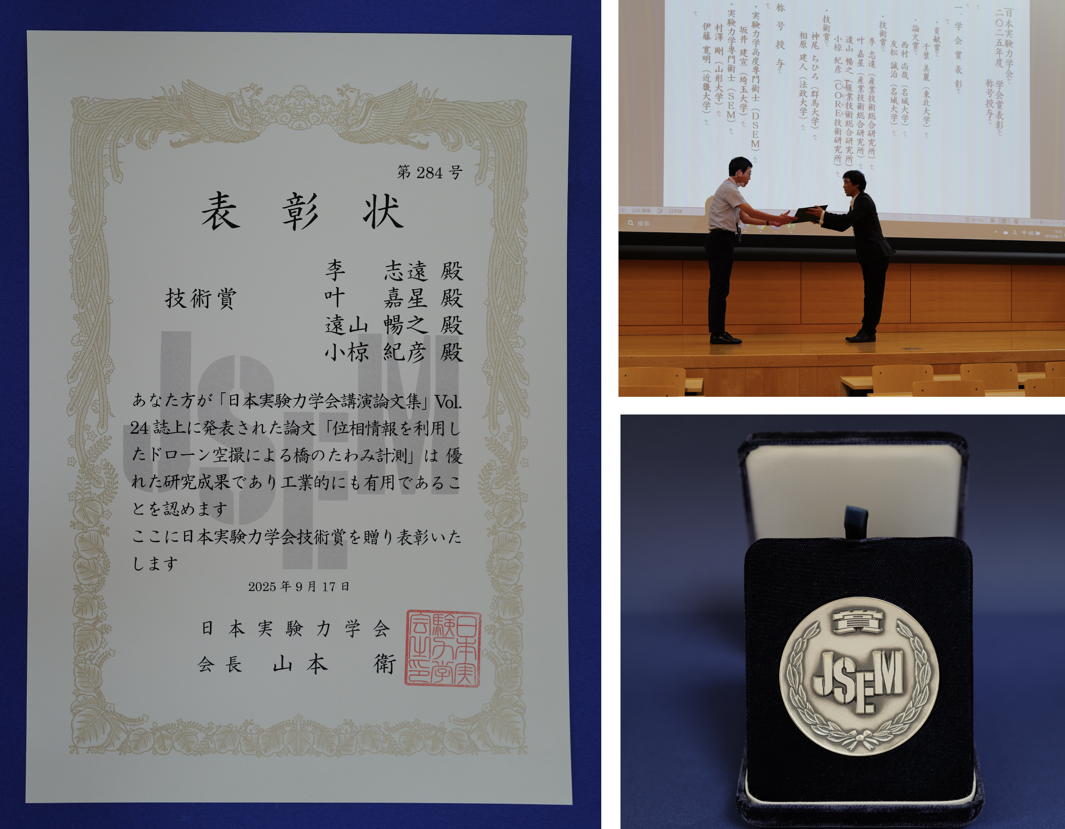 李 志遠・叶 嘉星(非破壊計測研究グループ)、遠山 暢之(レジリエントインフラ実装研究センター)らが日本実験力学会から、「位相情報を利用したドローン空撮による橋のたわみ計測」で、2025年度日本実験力学会技術賞を受賞(2025/9/17)いたしました。 |