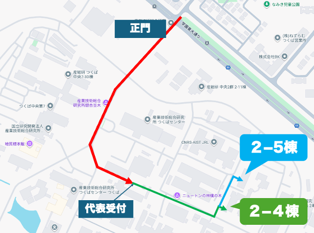 先進ビーム計測研究グループの研究活動拠点は主に産業技術総合研究所つくばセンター内の2−4棟、2−5棟になります。産総研つくばセンターへの交通手段等の詳細は、産総研公式ホームページ入構手続き案内に掲載されていますので御参照下さい。自動車で来所の場合、正門の守衛所で入構手続き後、正門より正面にお進みいただき2-1棟1F受付までお越しください。徒歩、バス、タクシーで来所の場合、直接2-1棟1F受付までお越しください。2-1棟までは、上図を参照ください。