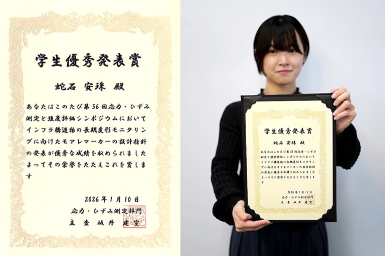 蛇石 安珠(非破壊計測研究グループ 技術研修、東京理科大学)が一般社団法人日本非破壊検査協会から、「インフラ構造物の長期変形モニタリングに向けたモアレマーカーの設計指針」で、学生優秀発表賞を受賞(2026/01/10)いたしました。 |