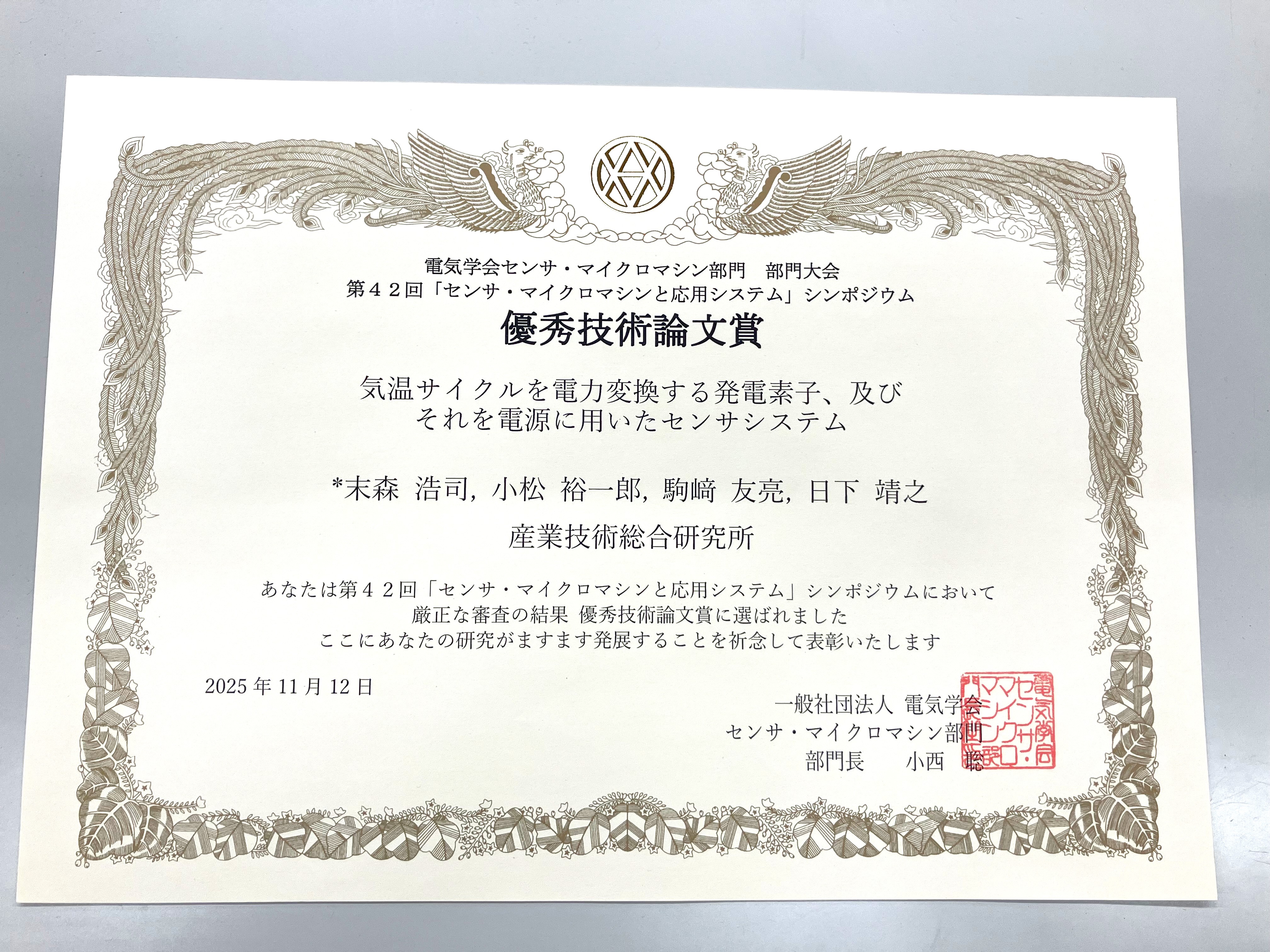 - 受賞: 気温サイクルを電力変換する発電素子、及びそれを電源に用いたセンサシステム